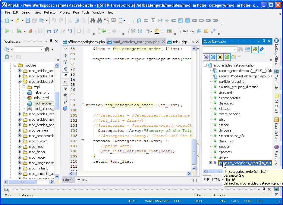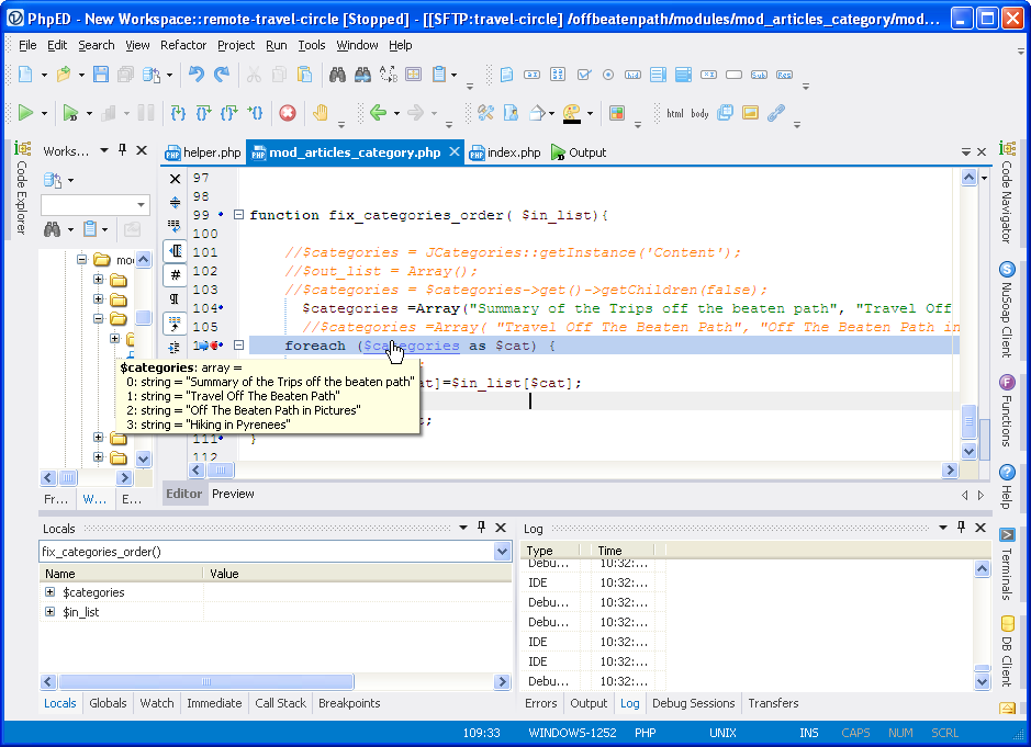 However, it should be noted that while debugging site live is fine – dbg debugger used by NuSphere will only get invoked on a request from specific IP – editing scripts live is hardly a good practice. Source control and development version of a web site are certainly good practice and there is a support for an integration of Tortoise GIT and SVN in PhpED, however native built client would be a much better feature.