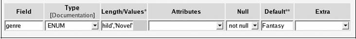 We add a field named genre and define it as an ENUM. For now, we choose to put short codes in the value list, and one of them (F) as the default value: